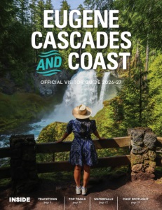 TRAVEL LANE COUNTY 541.484.5307 info@EugeneCascadesCoast.org Eugene, Cascades & Coast Visitor Information Center 550 Pearl Street, Eugene Inside 5th Street Market Alley EugeneCascadesCoast.org President/CEO Samara Phelps Project Managers Emily Forsha, Melanie Griffin, Megan Temple Copyright © 2026 Travel Lane County. All rights reserved. 120,000 / April 2026 Information in this guide was gathered from numerous sources. To the best of our knowledge, all information was accurate at the time of publication, but it is not guaranteed. Prices, dates and other information are subject to change. The businesses listed have partnered with Travel Lane County for this publication and have shown a commitment to the visitor industry. Additional services are available throughout the region. As representatives of the hospitality industry, we are welcoming and oppose discrimination of any kind. The official guide of President/CEO Andrew Insinga Director of Custom Publishing Megan Kirkpatrick Creative Director Nickie Bournias Senior Editor Jennifer Burns Bright Copy Editor Morgan Stone Senior Account Executive Betsy Hand Advertising Production Coordinator Max Cyphers Digital Production Coordinator Alison Kattleman Controller Bill Lee Published in conjunction with On the cover (left to right): Benton-Lane Winery by Maggie Kirkland; McKenzie River Trail by @deafjourney; view from Heceta Head Lighthouse by Taylor Higgins OFFICIAL VISITOR GUIDE 2026-27 INSIDE TOP TRAILS page 10 WATERFALLS page 12 CHEF SPOTLIGHT page 28 TRACKTOWN page 8 26ECC_Covers_Final.indd 1 3/9/26 9:44 AM OFFICIAL VISITOR GUIDE 2026-27 INSIDE TOP TRAILS page 10 WATERFALLS page 12 CHEF SPOTLIGHT page 28 TRACKTOWN page 8 26ECC_Covers_Final.indd 1 3/9/26 9:44 AM OFFICIAL VISITOR GUIDE 2026-27 INSIDE TOP TRAILS page 10 WATERFALLS page 12 CHEF SPOTLIGHT page 28 TRACKTOWN page 8 26ECC_Covers_Final.indd 1 3/9/26 9:44 AM Welcome to a destination that embraces all who visit, with a commitment to enhancing accessibility and inclusion across the Willamette Valley, Cascade Mountains and Oregon Coast. Our commitment starts with making it easy to get here, find information, book your trip and engage in meaningful experiences. This is a place for all ages, abilities and identities to be active participants in the adventures that our region offers year-round. Enjoy waterfall trails and snow sports nearby, or cheer on the University of Oregon Ducks and the elite athletes who compete right here in TrackTown. Eugene has a history of commitment to universal access. We are proud to have been a part of making Oregon the first state to be Accessibility Verified by Wheel the World, an online travel platform that promotes accessible attractions, lodging, restaurants and more. Gain a sense of place by learning about the people who call the area home. The Kalapuya, Siuslaw and Alsea tribes are among some of the first inhabitants of this All Are Welcome Here region. Connect to the first stewards of this land by visiting the Kalapuya Talking Stones in Eugene and Springfield or following the Amanda Trail at Cape Perpetua on the Oregon Coast. Through the Strides for Social Justice app, you can learn about Eugene’s first Black residents and more recent history-makers paving the way for greater equity in sports and beyond. Celebrate love of all kinds at Eugene PRIDE in the summer. Our region has a history of sustainability and a focus on locally sourced food, climate activism and environmental innovation. We invite you to be part of our sustainability culture by shopping at local businesses, visiting a salmonsafe winery, tasting local flavors from our farmers markets and exploring by electric bike or via public transit. We love our wild spaces and we’re dedicated to protecting them for future generations. Do your part by making sure to follow Leave No Trace principles when you’re venturing into the outdoors. We can’t wait for you to discover all this beautiful region has to offer. Travel Lane County | EugeneCascadesCoast.org | 541.484.5307 3