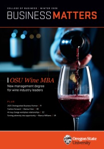 We believe in the power of business to improve lives and transform communities. That belief drives our work of supporting students, advancing research and building partnerships that strengthen Oregon’s economy. In the College of Business, we prepare students to lead in a world shaped by innovation and change. That preparation is grounded in hands-on learning, dedicated faculty mentorship and the strength of our alumni network. In this issue, you’ll learn about our new MBA in wine business management, a collaborative effort between the College of Business and the College of Agricultural Sciences. This program is an exciting step forward. It deepens our support for the vital Oregon food and beverage industry while expanding opportunities for learners across the state and beyond. You’ll also read about Bianca Williams ’22, whose journey from England to Portland and from professional life to higher education demonstrates the power of resilience and authenticity. As a senior strategy consultant and active mentor, Bianca is helping shape a more inclusive future of business, one that embraces both innovation and human connection. And you’ll meet Marisa Chen ’20, named a 2025 OSU Changemaker by the Oregon State University Foundation. Marisa blends creative leadership with community building and helps design students make meaningful connections and navigate their careers with confidence. Finally, new research from Professor Keith Leavitt explores how AI is changing the way teams function at work. His insights remind us that future leaders must understand not only technology, but also the people and relationships it affects. Together, these stories highlight what makes our community distinct — students and faculty who are ambitious and engaged, and alumni who are deeply invested in supporting others. Thank you for being part of the College of Business.I look forward to all we’ll accomplish in the year ahead and to the impact we’ll continue to make together. Wishing you a safe and restful holiday season, Tim Carroll, Ph.D. Sara Hart Kimball Dean, OSU College of Business Letter from Dean Carroll Business Matters | 3